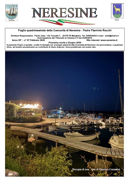 Comunicato del Comitato agli amici internauti. Un altro anno è trascorso e ci accingiamo ad iniziarne un altro ancora. Il prossimo tra l'altro, sarà l'anno che concluderà l'attività del Comitato in carica, infatti a fine 2026 saranno indette le elezioni tra gli aderenti regolarmente iscritti per eleggerne uno nuovo per il quadriennio 2027-2030. Intanto per il 2026 non promettiamo cose straordinarie, ci impegnamo però fin d'ora di comporre e far recapitare ai nostri aderenti il Foglio "Neresine" nelle tre date ormai canoniche di: febbraio, giugno ed ottobre. Un Foglio che stiamo sempre attenti a non renderlo banale ma di migliorarlo in qualità e grafica.Insomma cercheremo di fare del nostro meglio e ci scusiamo se qualche volta non ci siamo sempre riusciti.